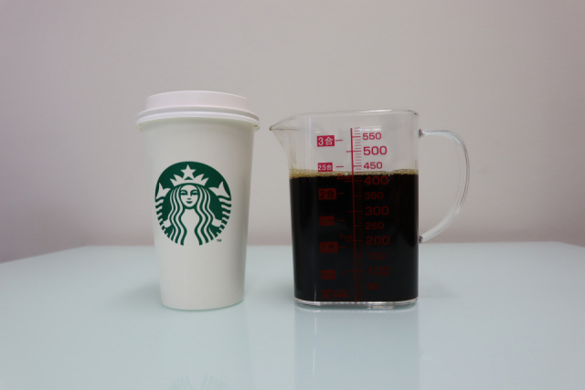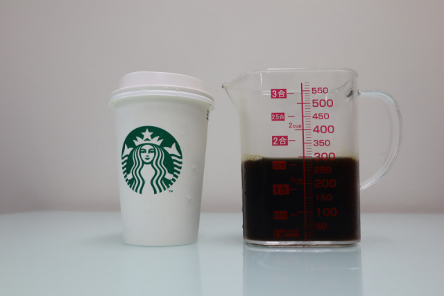 実際にはかってみると、グランデのホットは430ml、アイス(氷あり)は460mlでした。