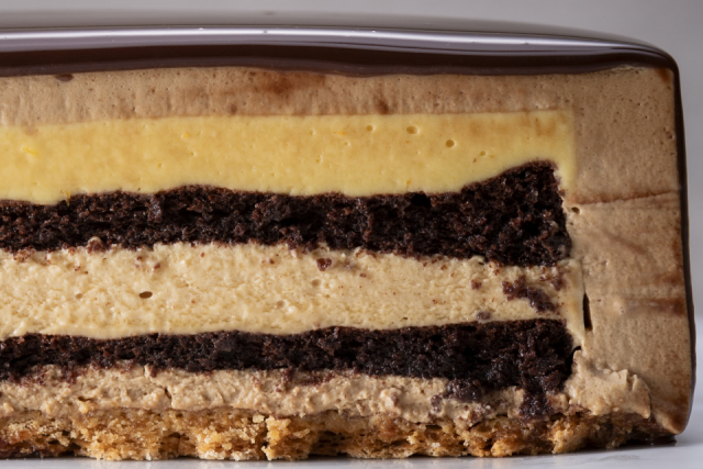 コーヒーシロップやキルシュシロップを染み込ませたピスタチオジョコンド、ピスタチオバタークリーム、ラズベリージャム、ピスタチオガナッシュ、ヘーゼルナッツのチョコレートを丁寧に層状に仕上げた見た目も美しいオペラ。