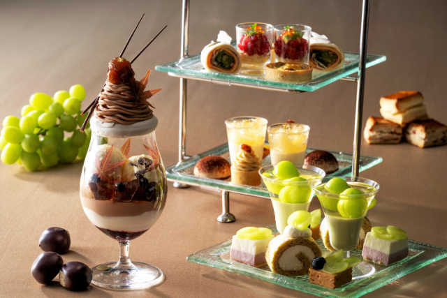 宝石のようなビジュアルが目を引くシャインマスカットと、和栗のモンブランなど秋の味覚が一挙に味わえる珠玉のアフタヌーンティーです。