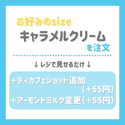 また、ディカフェへの変更は+55円のカスタマイズ料金がかかります。55円で時間や環境問わずコーヒーを楽しめるはうれしいですよね。注文方法は、ディカフェ変更可能のドリンクをセレクトし、「ディカフェ変更でお願いします」と伝えるだけでOKです。