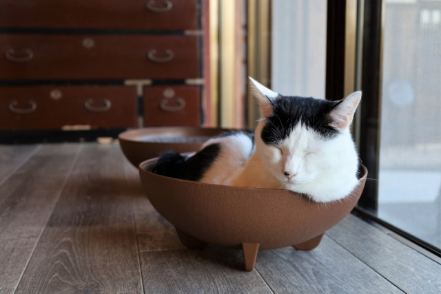 スタッフ猫たちは現在6匹。縁側に置かれたベッドでまるくなって眠ったり、キャットタワーの上から人間観察をしたり。時間制限がないので、ゆるやかな時間が流れる和の空間でゆったり過ごせます。