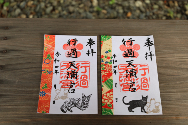 御朱印にも2匹の姿が。写真の2種のほか、2匹が並ぶ横タイプも。各500円