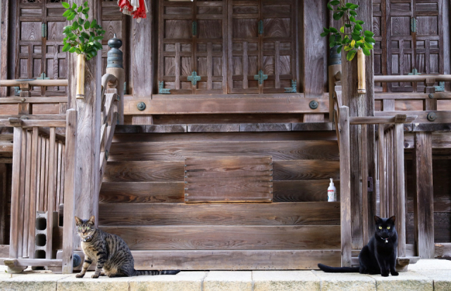 黒猫のコミケとキジトラのコケイヤンは宮司さん宅で暮らし、14時頃から夜にかけて広い境内をパトロールするのが日課です。
