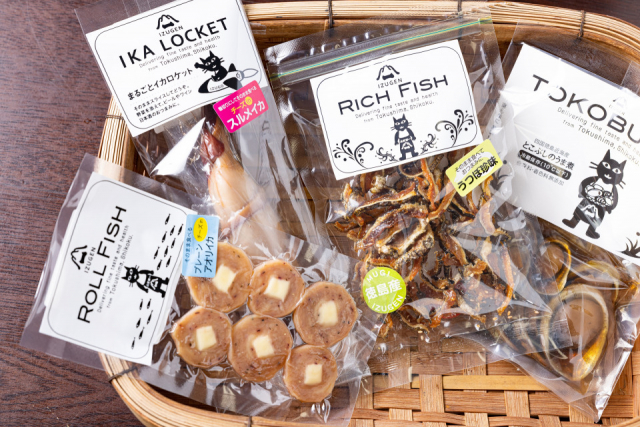 江戸末期創業の鮮魚仲卸の老舗。現在の7代目が「子どもたちにももっと気軽に魚を食べてほしい」と、鮮魚を使った無添加の加工品の製造・販売をスタート。とこぶしの旨煮や煮漬けたイカでチーズを巻いた「イカロケット」など30種類にも及び、おみやげとしても人気があります。