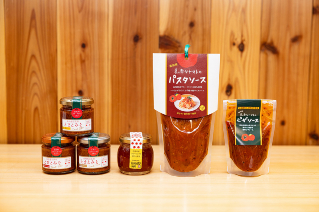とまとみそ各650円、トマトジャム500円、パスタソース250g830円、ピザソース100g360円