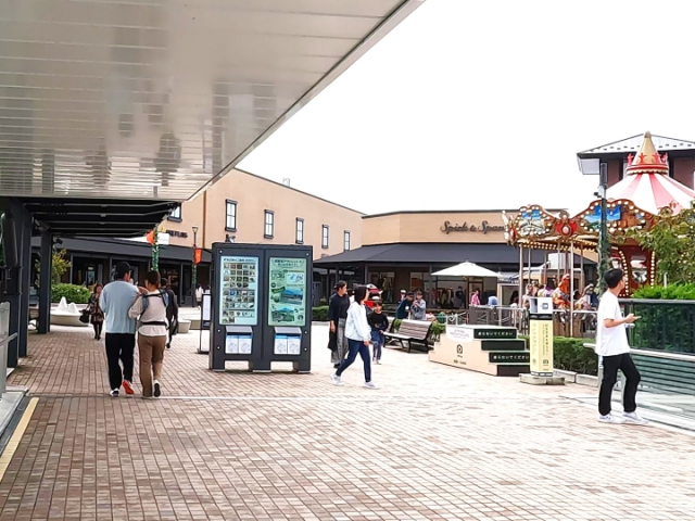御殿場プレミアム・アウトレットの入り口までの道中には、団体用のバス乗り場や自動販売機があります。