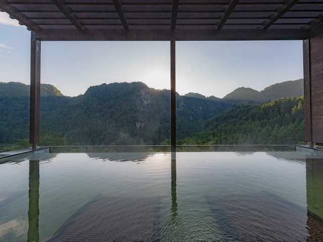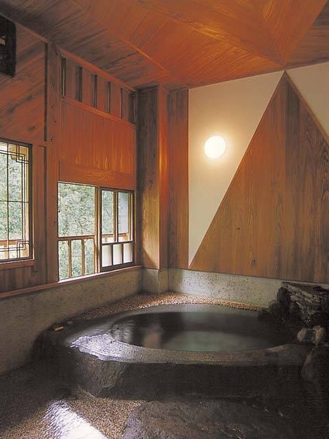 筑後川源流の渓谷美を見下ろす国道212号沿いに建つ貸切専門の温泉スポット。全24室の湯船は、巨石をくりぬいたもの、切り石、五右衛門風呂ふうなどすべてつくりが異なります。