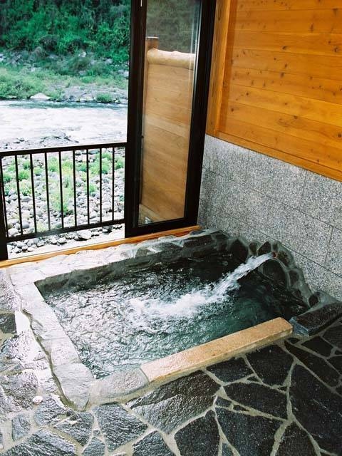 玖珠川沿いにあり、渓流を眺めながら入浴できる露天大浴場と、8室の貸切風呂があります。貸切風呂はすべて半露天で、岩風呂が4室、切り石風呂と檜風呂が各2室。川を渡る風がここちよいですよ。
