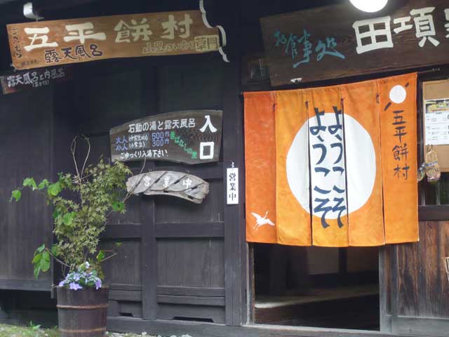 福地温泉唯一の共同浴場。男女それぞれに内湯と露天風呂を備えています。湯上りには、囲炉裏端でもっちりした食感が評判の五平餅もぜひ味わいたいですね。