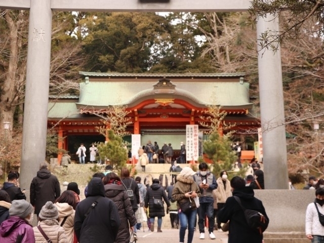 正月は多くの参拝者で境内が賑わう鶴岡八幡宮。源頼義が奥州を平定した際に京都の石清水八幡宮を現在の材木座付近に勧請し、お祀りしたことが始まりといわれる。治承4(1180)年、源頼朝公が鎌倉に本拠地を置くと同時に現在地へ遷し、建久2(1191)年上下両宮の現在の形に整えた。9月の例大祭で行われる流鏑馬神事は800年以上の歴史を持ち、世界的にも有名。元日から7日までは、「御判行事」という御神印を額にいただき、無病息災や開運厄除などを祈る神事が行われ、境内は多くの参拝者でにぎわいをみせる。