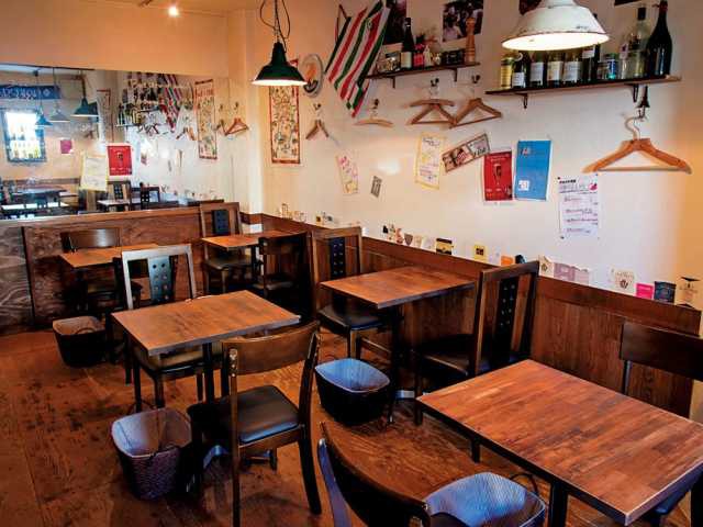 イタリアのトラットリアを思わせる店内。地元の食材を使ったメニューが好評です。パスタランチには、生ハムサラダ、自家製パン、ドルチェ、コーヒーが付きます。