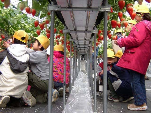 いちごの収穫体験ができる。秋にはさつまいもやピーナッツも収穫