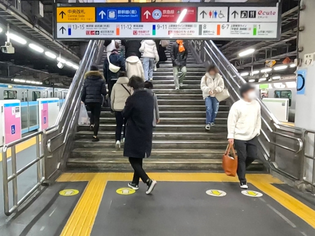 ホームを下りた位置で右折か左折かは変わってくるので、階段を上り切ったらいったん止まって方向を確認するのがおすすめです。