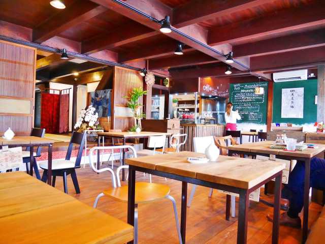 木の温もりが広がる古民家カフェ。店内には座敷もあり、靴を脱いでくつろげるのがうれしい。ソフトドリンクの注文で自家製フレンチトーストのサービスも(要確認)。