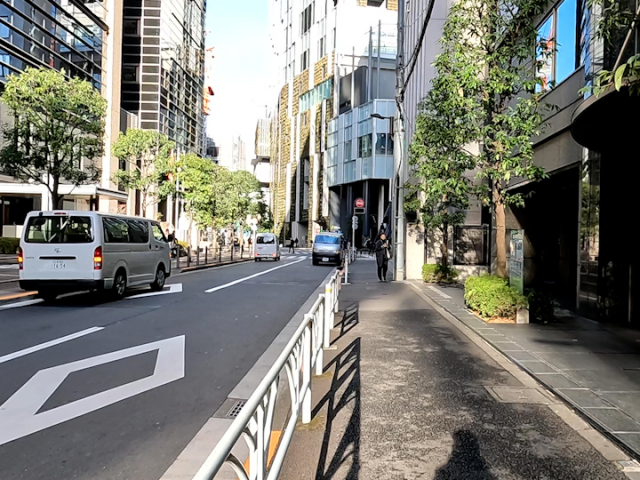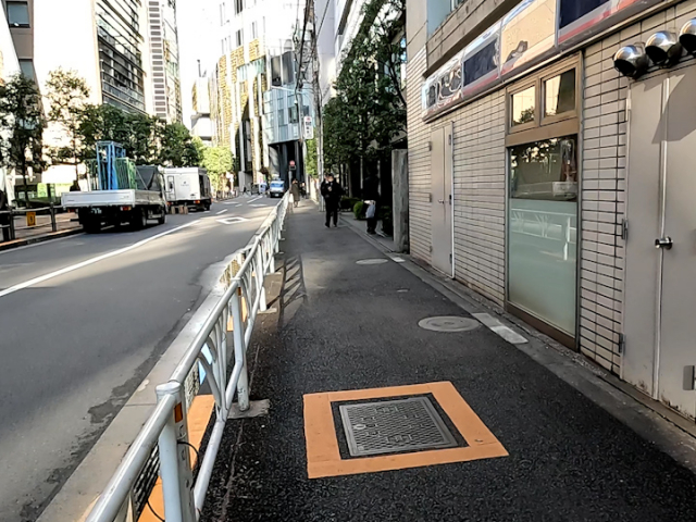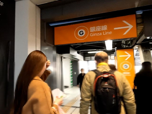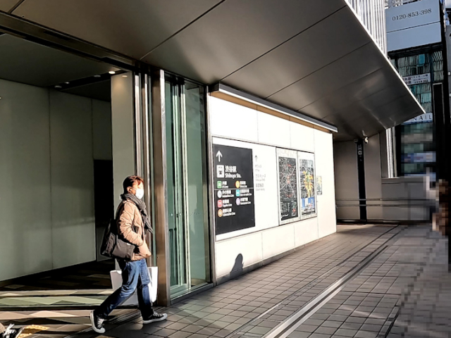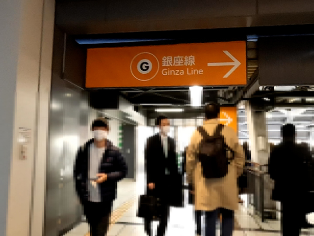 少し歩くと、左前方に「銀座線などの案内看板」が見えてきます。ここを左折。建物内に入りましょう。