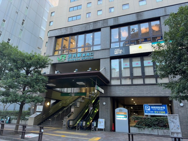 JR渋谷駅の新南口を出たら、目の前の横断歩道を渡ります。