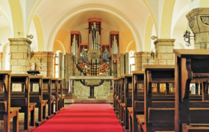 高い天井と石の壁に心和む