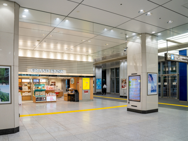 八重洲中央口改札を出た方は左斜め前へ進み、「GRAND KIOSK」の角を左折し直進します。
