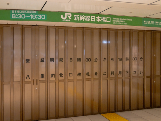 日本橋口の注意点1つ目は利用時間が限られていること。新幹線日本橋口の利用時間は8時30分〜19時30分のため早朝や夜遅い時間は利用できません。