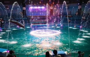 そのまま歩いていくと、天井付近にモニターがたくさん設置されているエリアに入ります。直進を続けましょう。
