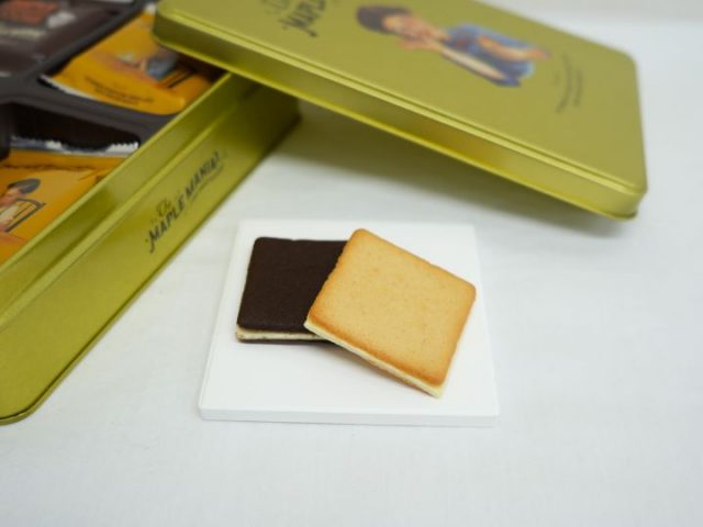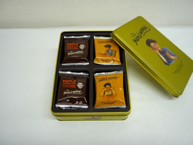 なかでも人気の商品が「メープルクッキー詰合せ缶」。高級感あふれる金色の缶に、メープルバタークッキー8枚、メープルショコラクッキー8枚を詰め合わせたクッキー缶です。