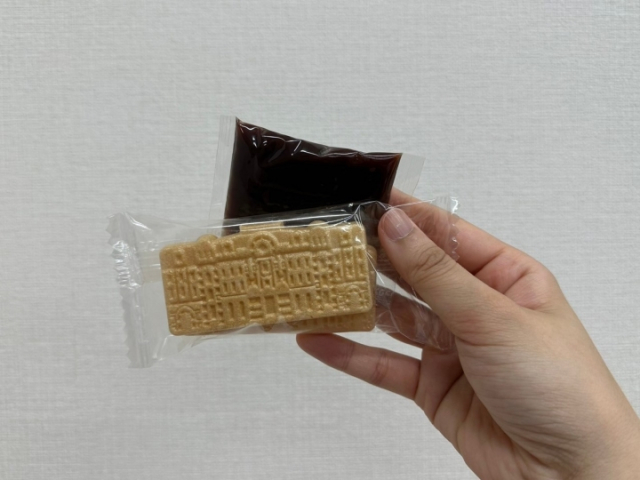 レンガの形が一つずつ再現されていて、食べる前にじっくりと観察したくなるほど丁寧に作られています。あんこと最中は分かれた状態で、それぞれが別の袋に入ってるのが特徴。