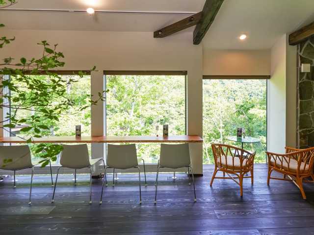 崖の上ギリギリに建つユニークな立地と眺めが評判。豊平川の支流・白井川を見下ろす、高さ40メートルほどの崖の上に立つ、絶景カフェです。サイフォンで落とすコーヒーや、手作りスイーツとともにくつろぎましょう。