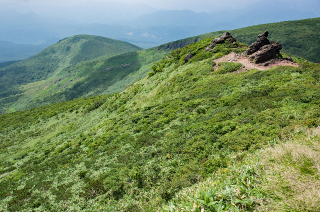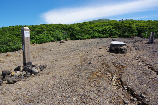 天狗平から分岐する須川コースは昭和湖付近の火山ガス濃度が高いため、現在は天狗平から苔花台まで通行禁止になっていて、須川温泉へのエスケープルートとしては使えません。ここから山頂までは天狗岩の脇を通過して、展望抜群の尾根を約20分の行程です。
