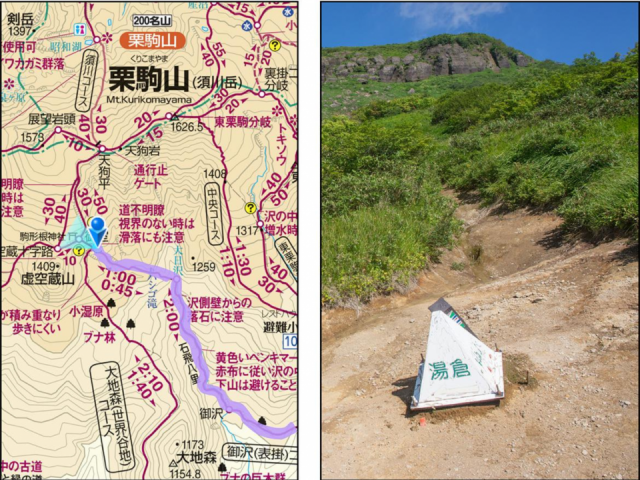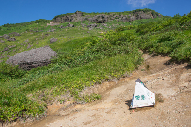 三角形の標識が置かれた御室下。左に大地森コース(湯倉と表示)が分かれ、御室は上部の岩壁に向かって直進します