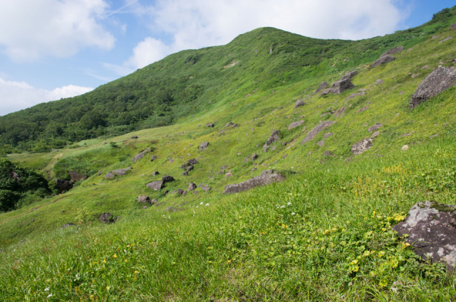 御室からベルト状に上部へ連なる岩壁の下部に沿って登ります。一部、草ヤブが道を隠すところもありますし、足場の悪いガレ場が続く場所で、しかも夏の暑い日差しを遮る木々が一切ありません。体力の消耗をおさえるためにも、ここは道沿いに咲くキンコウカやイワイチョウ、オオバギボウシなどの花々と雄大な栗駒山の姿を眺めながら、ゆっくりペース守って登ります。