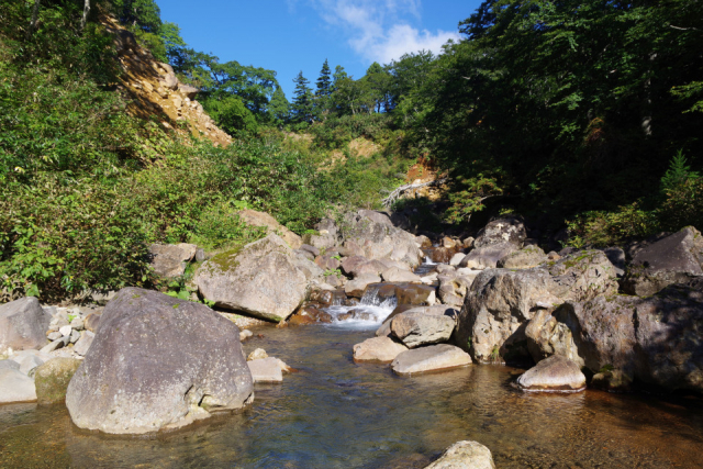白い湯の花が水面下に付着し、硫黄臭が漂う小沢を渡った先が御沢の出合です。飛び石で沢の対岸に渡り、石に腰掛けて沢靴に履き替えます。ここから大きな岩がゴロゴロした御沢を約2km遡行します。ロープを必要とする滝はありません。