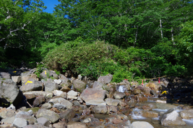 登山ルートは岩に描かれた黄色いペンキマークと、木々に付けられた赤テープで示されています。しかし大きな石の間をジャンプしないと渡渉できない箇所が随所にありますので、登山靴の場合は行き詰ってしまう場合が多く、ほとんどの方が靴を中まで濡らしてしまうようです。その点、沢靴の方が沢の中をジャブジャブ歩けるため、水と戯れながら楽しく、涼みながら歩けますし、ヤブに覆われた中洲を避けて通過することもできます。