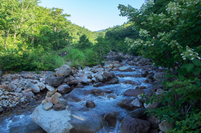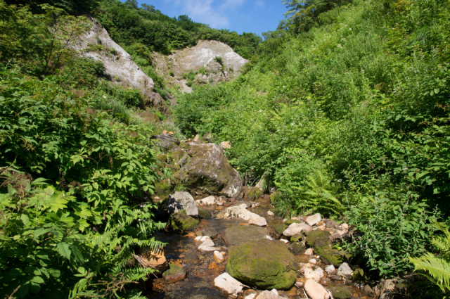 2時間ほどの沢をさかのぼると川幅が細くなり、右から大日沢が流入してきます。この二股は左の沢に入りますが、大日沢の奥に木々の間から栗駒山の山頂が望めます。長時間歩いてきたのに山頂はまだまだ遠いので少しがっかりするかもしれません。