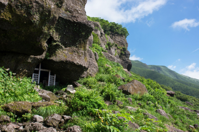 岩壁の基部まで登り詰めるとはっきりした登山道が現れます。右手に少し進めば栗駒山の山岳信仰の聖地で、かつて多くの人々が参拝した駒形根神社の奥の院に着きます。山岳信仰が盛んだった時代に思いをはせながら参拝します。