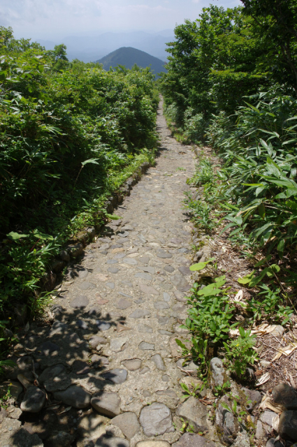 中央コースの下半分は玉石がコンクリートで固められた簡易舗装の道に変わります。現在、舗装の一部が壊れ、穴が開いていたり、斜めになっていたり、土が出ている場所が多くあります。よそ見していると転ぶので注意して歩きましょう。