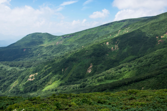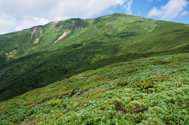 ザレたつづら折りの道が終わり、平坦な1408m付近にある小ピークに立つと、ハイマツの海の奥に栗駒山が端正な姿を見せてくれます。秋には「神の絨毯」と称される極彩色の見事な紅葉が広がる場所です。