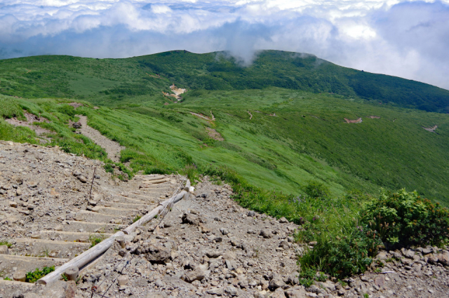 山頂から急な階段を下ります。正面に比較的平らでなだらかな山頂の東栗駒山が見えています。中央コースは手前の斜面に刻まれた道です