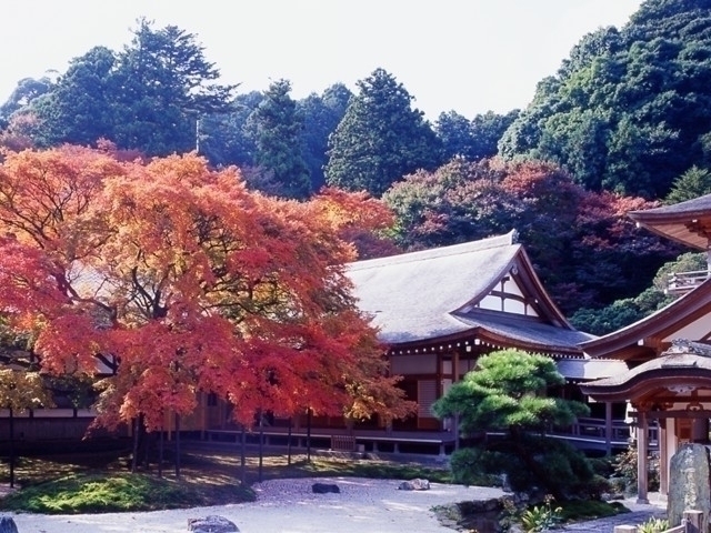 雷山の中腹にある古刹で、清賀上人により開基されたと伝えられる。本尊の巨大な千手観音は国の重要文化財。秋には、境内全体を200本以上のカエデが彩り、中でも大きく枝を広げる福岡県指定の天然記念物、樹齢400年の大カエデの紅葉が見事だ。また、室町時代に造られた心字庭園も見ごたえがある。