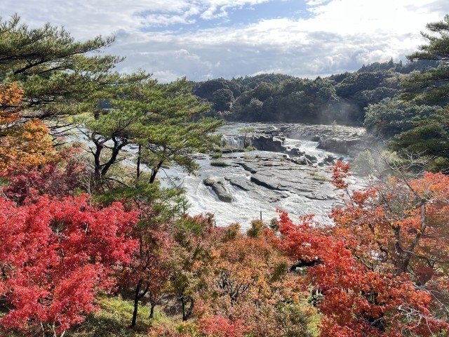 滝幅210m、高さ12m。「東洋のナイアガラ」とも呼ばれ、北薩摩を代表する観光名所。千畳岩を豪快に流れ落る滝の水しぶきと、色づいたモミジやイチョウの鮮やかなコントラストがすばらしい。