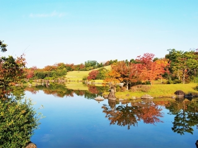 彦根城北側にある池泉回遊式庭園で、国の名勝に指定されています。中国・唐時代の玄宗皇帝の離宮になぞらえたといわれていて、江戸時代初期の庭を現代に伝える名園。秋にはイロハモミジが紅く染まり、池に映った紅葉も楽しめます。