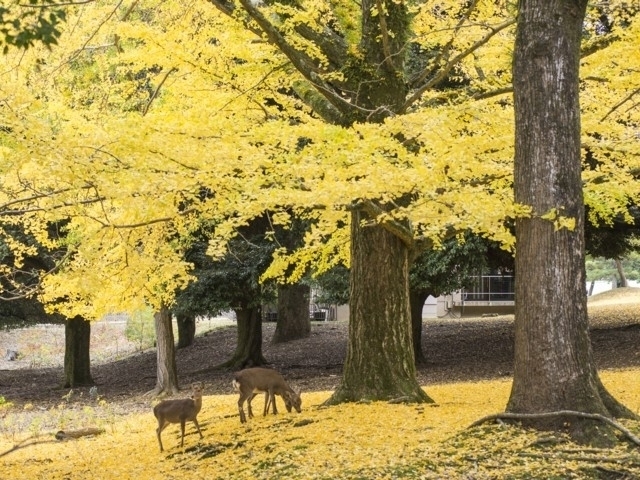 春日大社や興福寺、東大寺、国立博物館など、数々の社寺や文化施設が隣接する広大な公園。天然記念物の「奈良のシカ」が見られることでも有名です。モミジやイチョウなど多種類の紅葉が秋から初冬まで楽しめ、若草山を背に園内随所で様々な秋の情緒をかもしだしています。