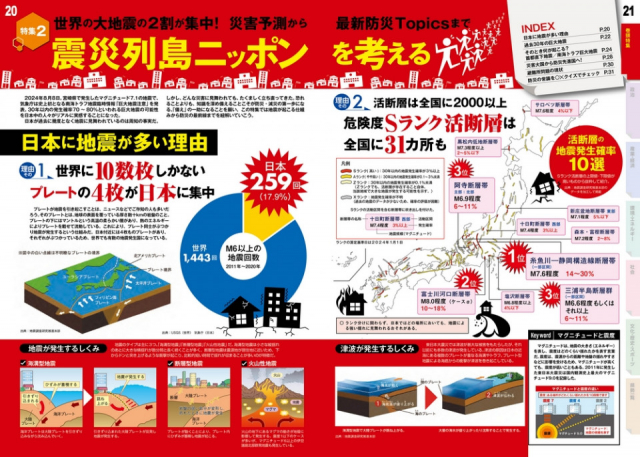 日本編では国民の3人に1人が65歳以上、5人に1人が75歳以上を迎える「2025年問題」に焦点を当て、超高齢社会がもたらすさまざまな課題を特集。第2特集では「震災列島ニッポン」と題し、最新の地震予測と防災技術、避難所問題などを取り上げています。