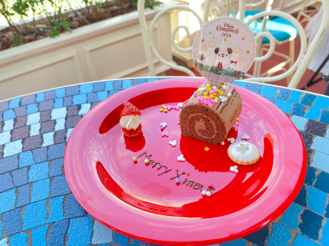 クリスマスの定番デザート「ブッシュ・ド・ノエル」に、付属のトッピングキットで自由に飾り付けを楽しめるメニュー。妖精「リルリンリン」の絵柄のビスケットがとても可愛いです!