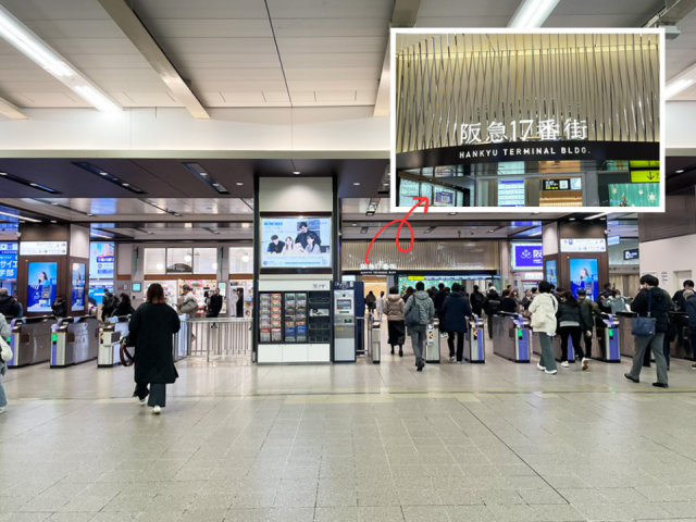改札中からの様子。中央付近の「阪急17番街」入り口下あたりが待ち合わせにおすすめです。