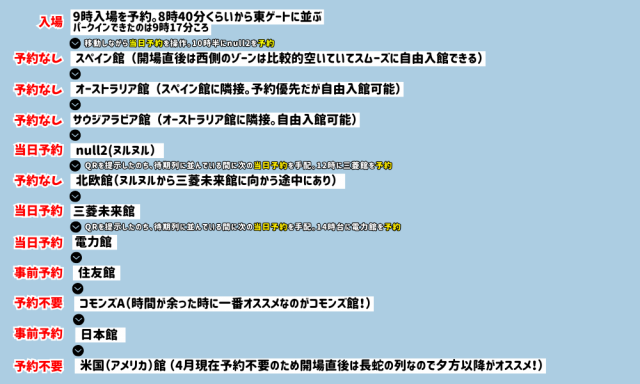 | 当日予約 | 入館後 | 当日予約を消化したら次のパビリオンの予約が可能になる |