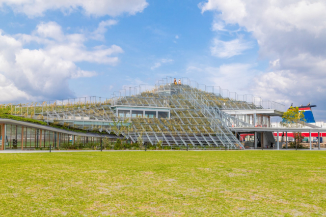 一番海に近い場所に広がる公園「TOTTEI PARK」は、地上2階建ての緑化された階段状の建物「緑の丘」が特徴です。