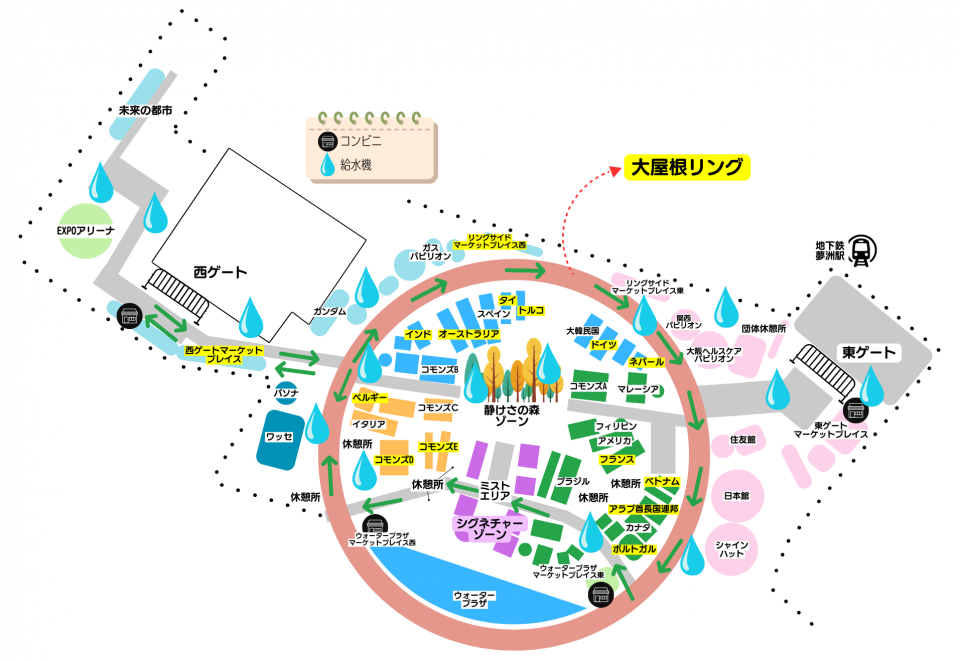 西ゲートから時計回りで大屋根リングの下を移動するプラン。