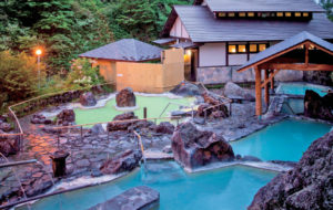6つの湯船に西の河原と万代の2つの源泉を引き、そのままかけ流しにしています。夕食には、旬の食材を使った和食会席膳が楽しめ、季節を感じさせる心尽くしのおもてなしを堪能しましょう。