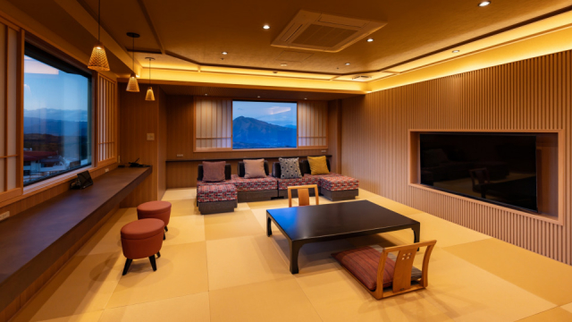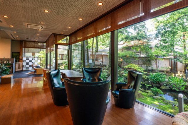 広々としたロビーからは中庭の緑が望め、地の食材を使った会席料理も人気です。貸切サウナやキャンプ場も併設しており、さまざまな楽しみ方ができるのが魅力です。