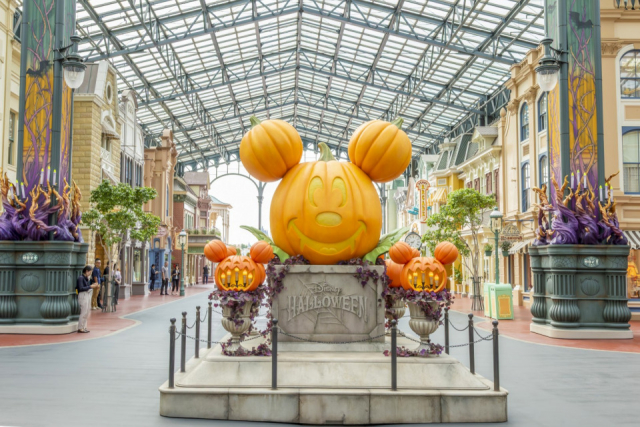 東京ディズニーランドのエントランスの花壇には、バンパイヤのように牙が生えたミッキーが出現。ワールドバザールにはパンプキンのデコレーション、シンデレラ城周辺にもヴィランズをイメージしたデコレーションがあり、ハロウィーン気分が高まります!